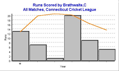 Total Runs 55 50s: 0 100s: 0 Innings 6 Not Outs 2 Average 13.75 High Score 20 Vs CARIBBEN SOCIAL CLUB 1999 Ducks 0